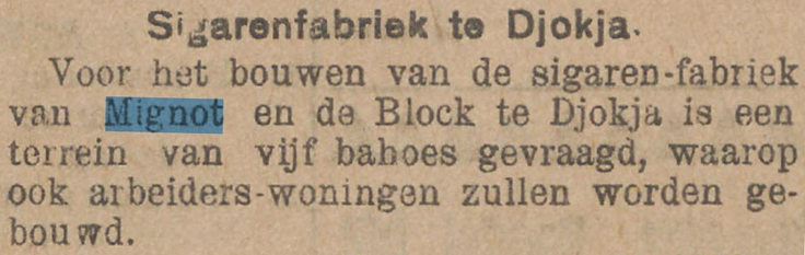 We lezen in de Indische "Locomotief" een bericht uit Djokja meldende:De heer Mignot firmant van Mignot en de Block te Eindhoven heeft aangevraagd een sigarenfabriek op te mogen richten in de kampong Boeloe (Bulu) waarvoor het terrein en de gebouwen gekocht worden van den Chinees Lie Kiem Tjoan.